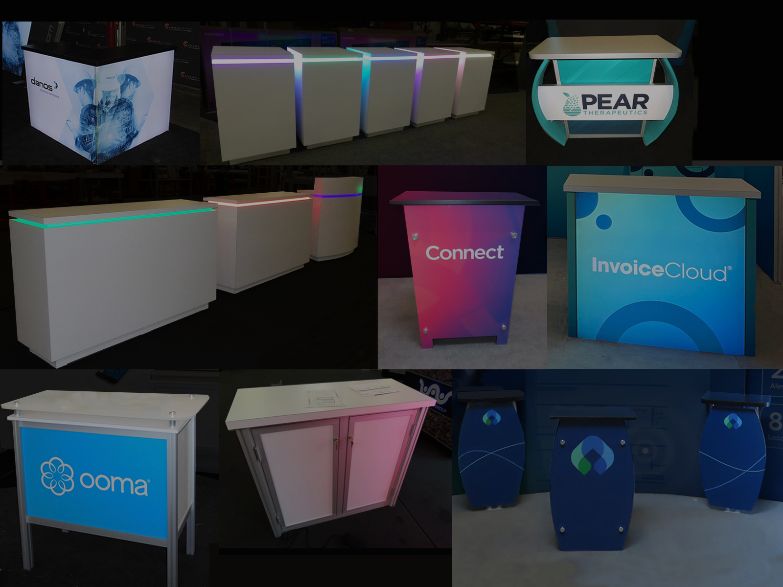 Most have secure locking storage. Consider adding wireless charging and LED accent lights. Visitors (and your booth staff) will appreciate these thoughtful features. Don’t see the perfect match for your display? Just let us know. We’ll design one just for you!