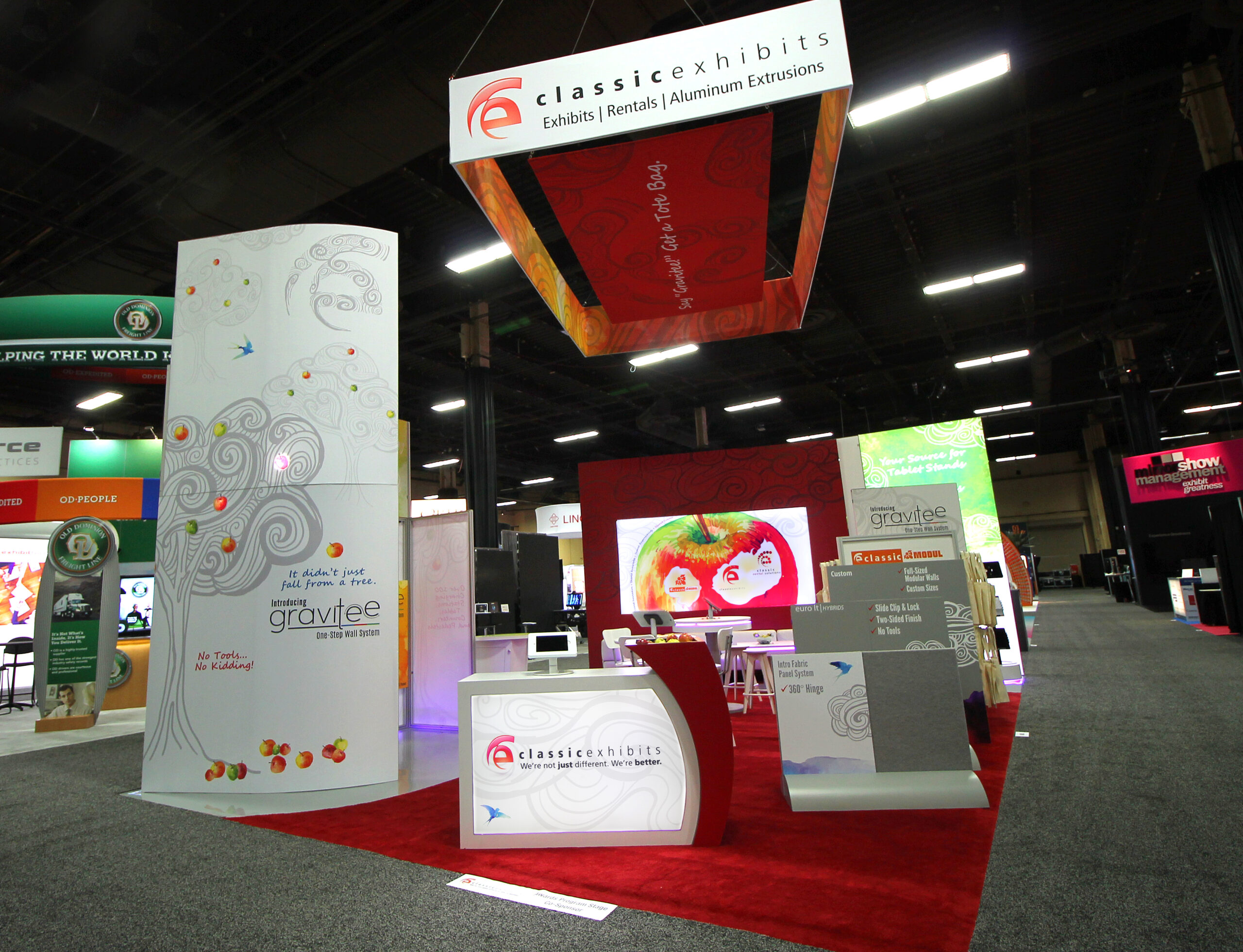 1. Gravitee, our new modular wall system, was the Belle of the Ball. Several Classic Distributors told me that Gravitee was “the next big thing” in exhibit industry. No tools. No loose parts. Seamless SEG graphics. Compatible with MODUL and Euro LT. What amazed me the most was the number of distributors who saw the demo, then came back again and again to see another demo. It’s as if they thought they’d finally catch the Classic magician hide the ball under the cup.