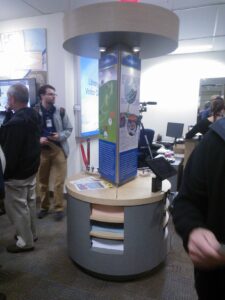This is when our pros shined. Jim Ponomarenko, our Production Manager, and his team detailed and built the structures — the custom framing for the graphics, the counters, lightboxes, the kid’s kiosk, and the reception area. They did an amazing job as the photos show.