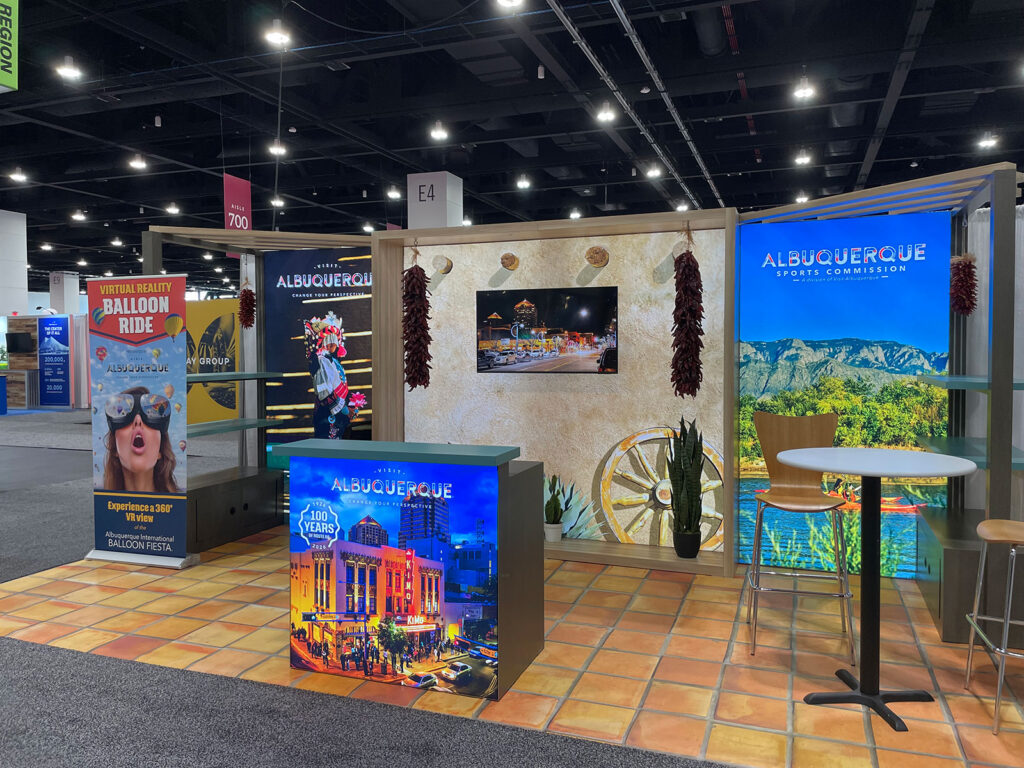 In this inline booth design, Visit Albuquerque wanted to elevate its presence at industry shows. It didn’t have the same well-funded budget as other larger tourism organizations, but what it had was a distinct identity. This custom design relied on modular components so it would assemble quickly and could be reconfigured to a 10 x 10 exhibit. In addition, it blended natural finishes with backlit graphics and faux tile flooring to create an authentic southwestern vibe. The modularity made it practical and cost-effective while the lightboxes, shelving, and printing flooring gave it an upscale custom look.